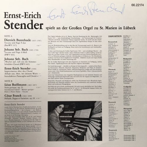 Ernst-Erich Stender – Spielt an der Großen Orgel zu St. Marien in Lübeck Posted in Klassik D 1980, ohne Label Rückseitig signiert von Ernst-Erich Stender. Post Views: 0