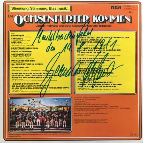 German Hofmann und seine Original Ochsenfurter Blasmusik – Die Ochsenfurter kommen Posted in Volksmusik D 1981, RCA CL 29464 Rückseitig signiert von German Hofmann. Post Views: 3