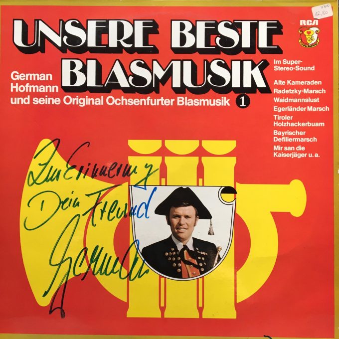 German Hofmann und seine Original Ochsenfurter Blasmusik – Unsere Beste Blasmusik 1 Posted in Volksmusik D 1977, RCA CL 29418 Signiert von German Hofmann. Post Views: 3