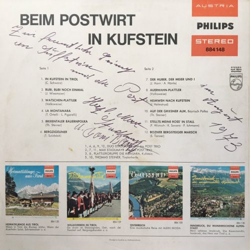 Max Stadlmayr – Beim Postwirt in Kufstein Posted in Volksmusik AT, Philips 884 148 Rückseitig signiert von Max Stadlmayr und weiterer Person. Post Views: 0