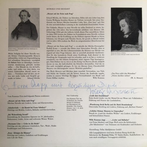 Rosenau-Trio Baden-Baden – Mozart auf der Reise nach Prag Posted in Klassik Signiert von allen drei Mitgliedern des Trios. Rückseitig zusätzlich mit Widmung von Willy Rosenau. Post Views: 3